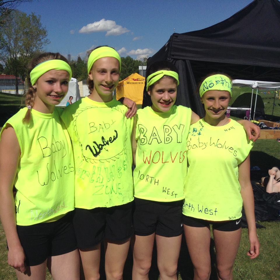 Brit, Big Mir, Kailey, and Bish sporting the 2014 NW Zone “official uniform” for the 4 x 400m relay. The quartet placed 7th in a field of 14 … not bad for two 3000m runners, a 1500 runner and a 100m/hurdler.