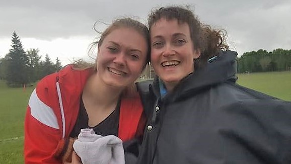 Sesmith’s Keyanna Anderson (left) and coach Ali Lario (right) celebrate Anderson’s gold medal performance in the discus at the 2018 ASAA High School Provinicials in Red Deer