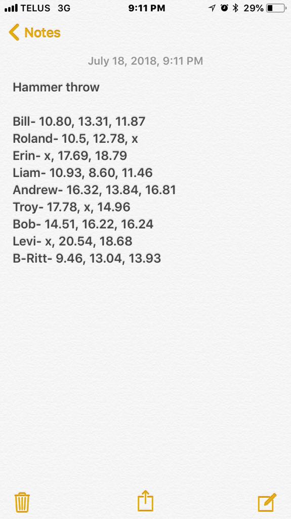 The new facility was christened with an informal hammer competition, Hammer Slam #1 on Wednesday. Levi Grose, a member of the Zone 8 Alberta Summer Games Track Team, placed first with a throw of 20.54m, a “scant” 50+ metres off of the Canadian Record.