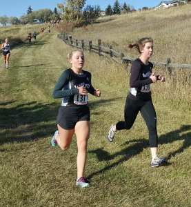Lydia Steinke (left) and Krista Frey (right) contributed to the Wolves women’s 5th place finish at the 2019 Augustana Open XC Running Race